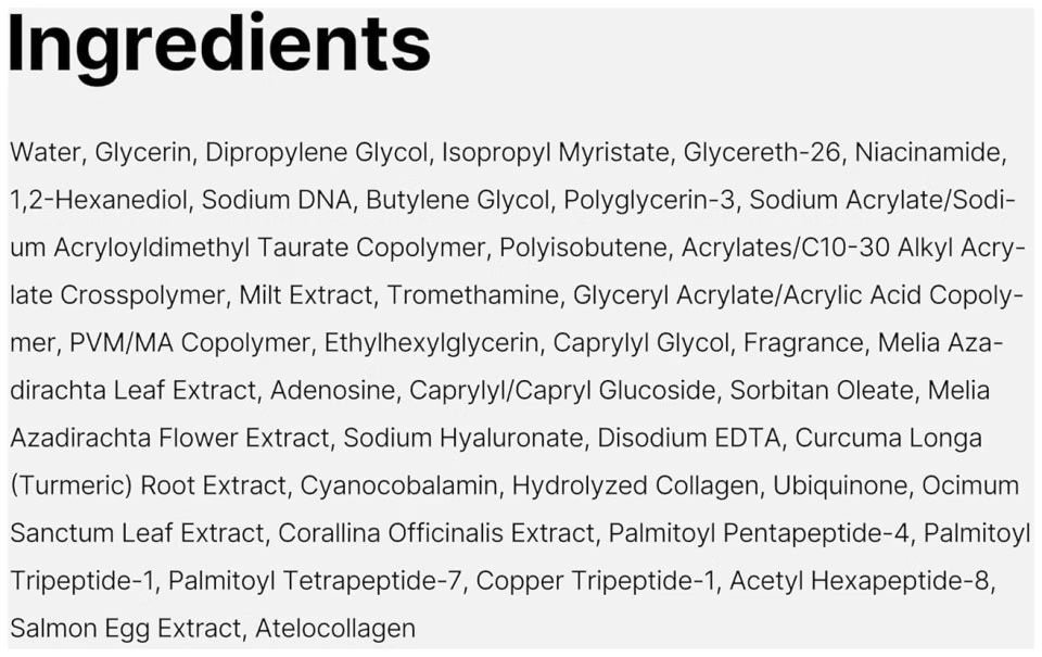 Wasser, Dinatrium-EDTA, Niacinamid, hydrolysiertes Kollagen, Natrium-DNA, Milchextrakt, Kupfertripeptid-1, Acetylhexapeptid-8, Palmitoylpentapeptid-4, Palmitoyltripeptid-1, Palmitoyltetrapeptid-7, Butylenglykol, 1,2-Hexandiol, Glycerin, Dipropylenglykol, Polyglycerin-3, Glycerylacrylat/Acrylsäure-Copolymer, PVM/MA-Copolymer, Natriumhyaluronat, Ethylhexylglycerin, Glycereth-26, Adenosin, Acrylate/C10-30-Alkylacrylat-Crosspolymer, Isopropylmyristat, Ubichinon, Duftstoff, Caprylylglykol, Tromethamin, Natriumacrylat/Natriumacryloyldimethyltaurat-Copolymer, Polyisobuten, Caprylyl/Caprylglucosid, Sorbitanoleat, Atelokollagen, Lachsei-Extrakt, Cyanocobalamin, Melia Azadirachta-Blattextrakt, Melia Azadirachta-Blütenextrakt, Curcuma Longa (Kurkuma)-Wurzelextrakt, Ocimum Sanctum-Blattextrakt, Corallina Officinalis-Extrakt