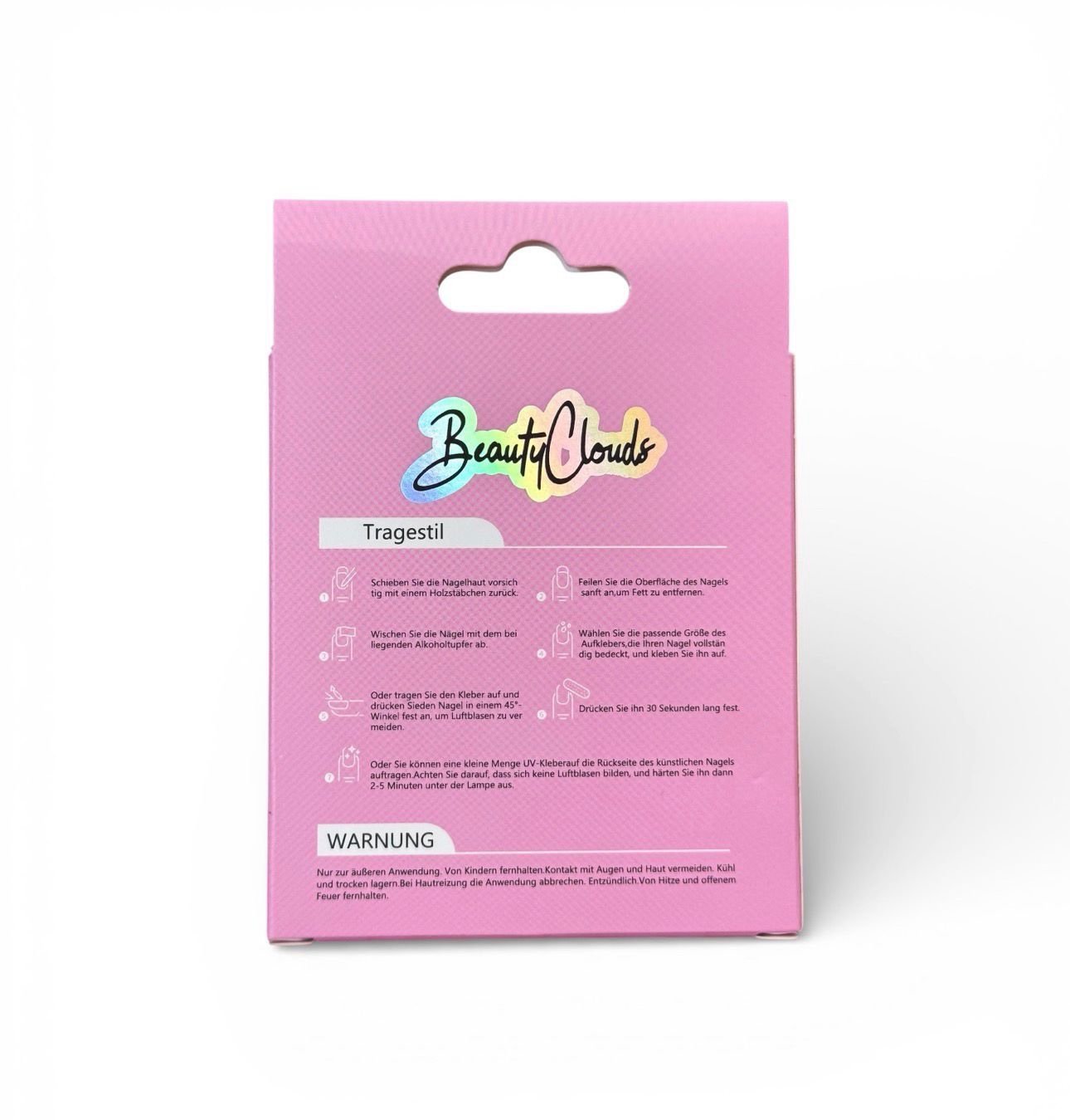 Nägel mit dem Alkoholtuch reinigen, Nagelhaut vorsichtig zurückschieben, passende Größe auswählen und mit Kleber oder Klebepad befestigen.