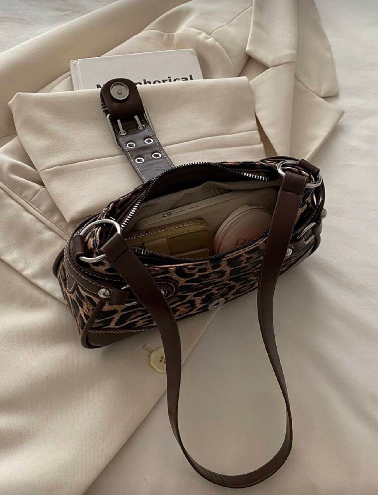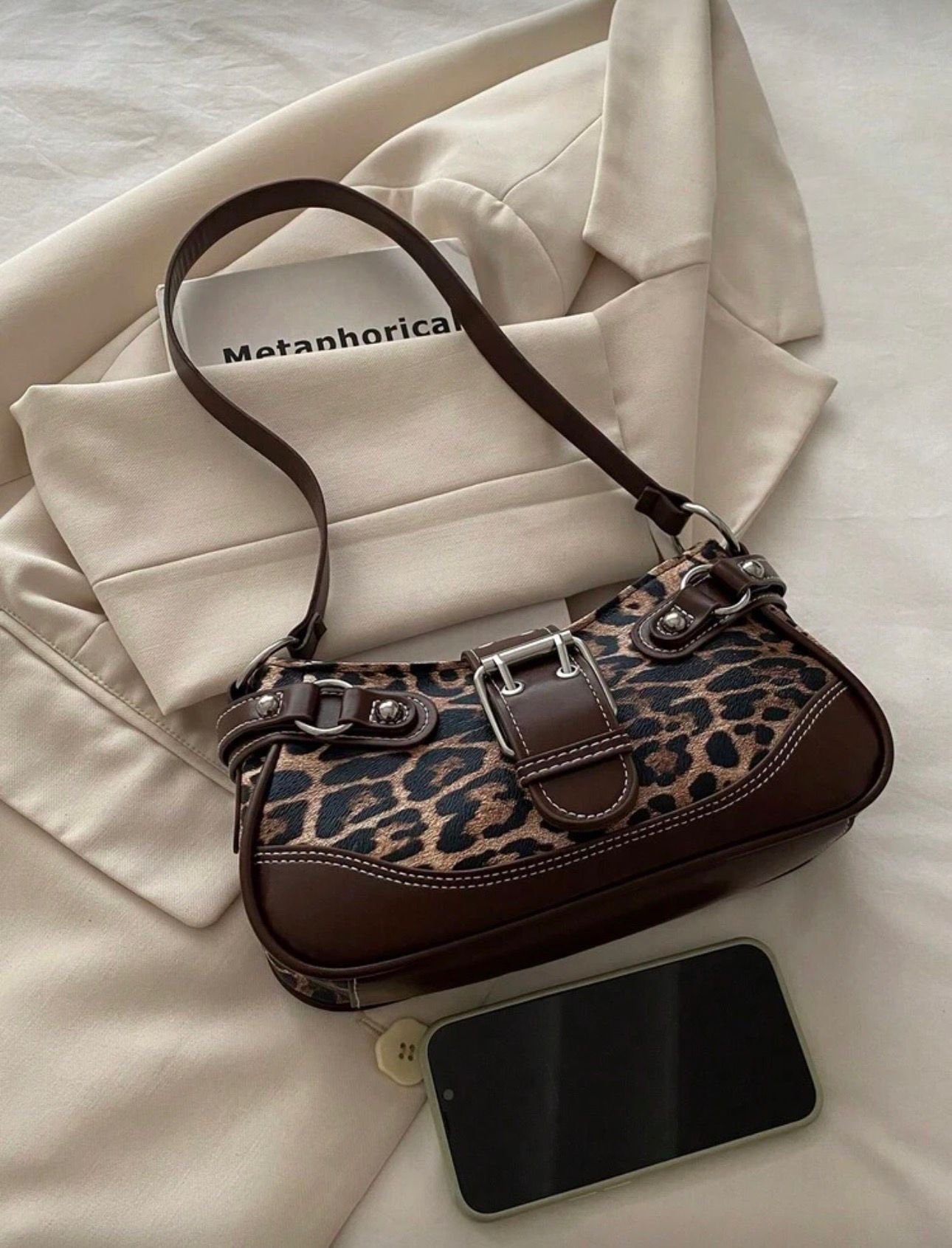 Leopard Schultertasche mit Leder Details & Schnalle – Bild 3