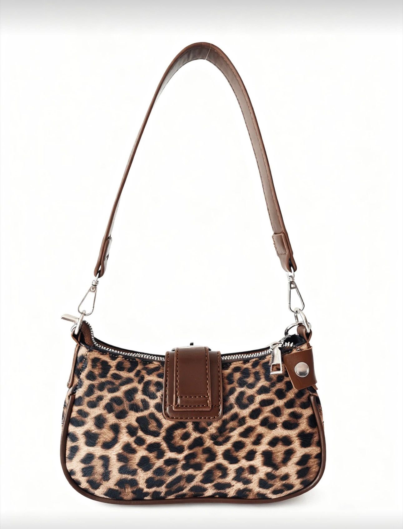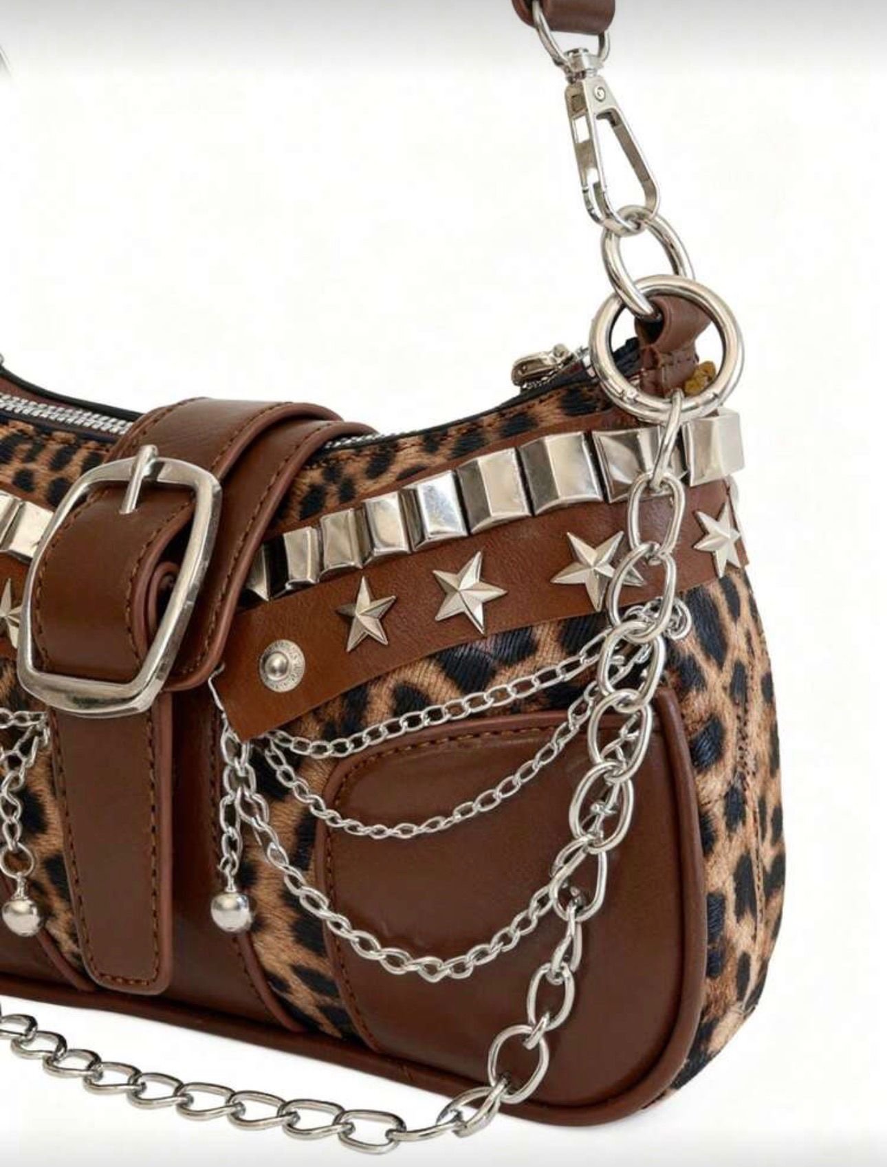 Diese auffällige Schultertasche kombiniert trendiges Leopardenmuster mit edgy Details und wird so zum absoluten Statement-Piece. Die Mischung aus braunem Kunstleder und Animal-Print verleiht der Tasche einen modernen Y2K- und Streetstyle-Look.