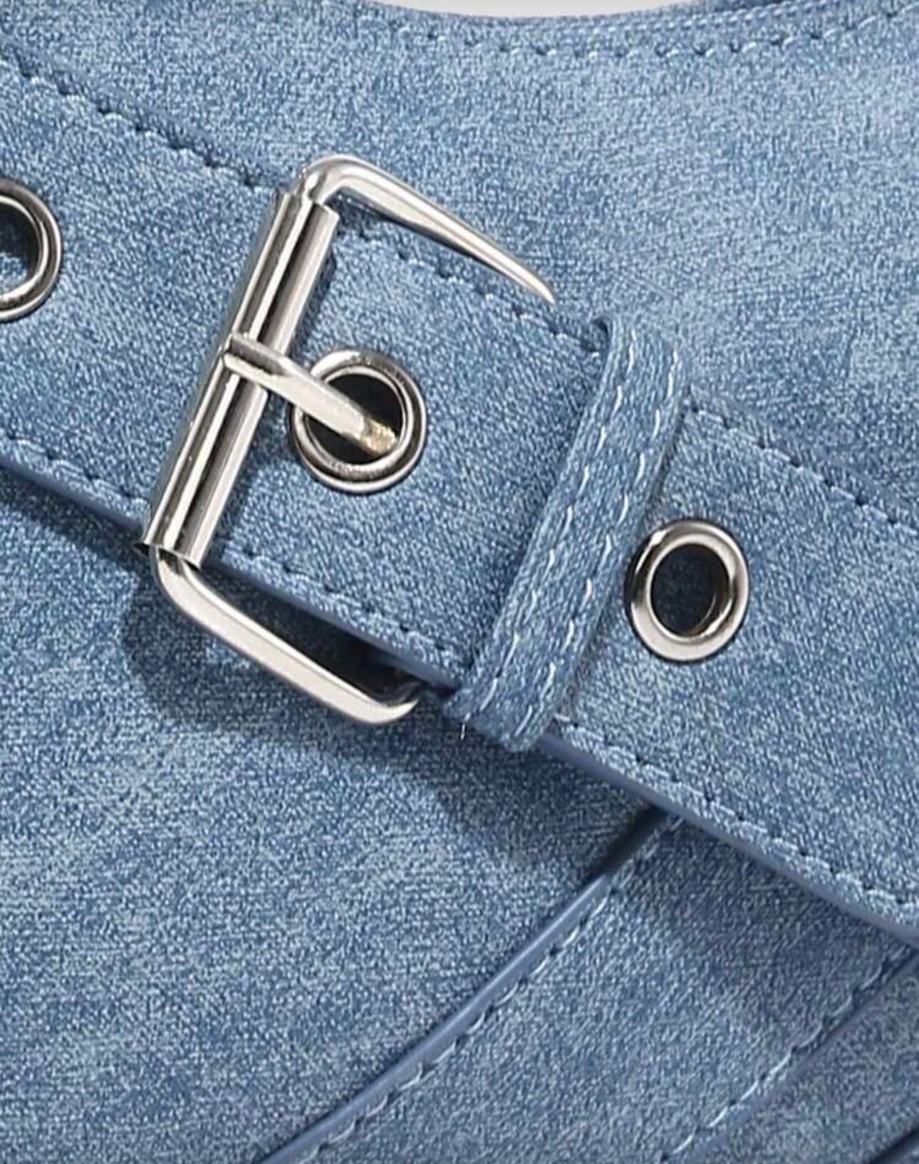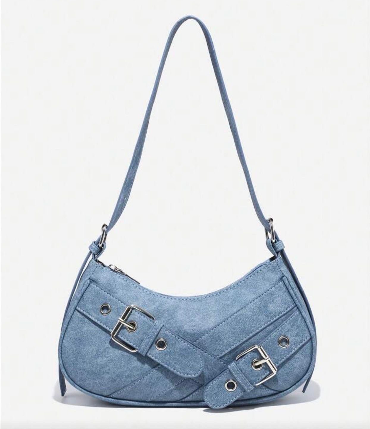 Diese stilvolle Schultertasche überzeugt durch ihr modernes und zugleich zeitloses Design. Gefertigt in einem sanften Hellblau, verleiht sie jedem Outfit eine frische und trendige Note. Die geschwungene Form sorgt für eine feminine Silhouette, während die dekorativen Riemen mit silberfarbenen Schnallen und Ösen dem Modell einen edgy, modischen Charakter verleihen.