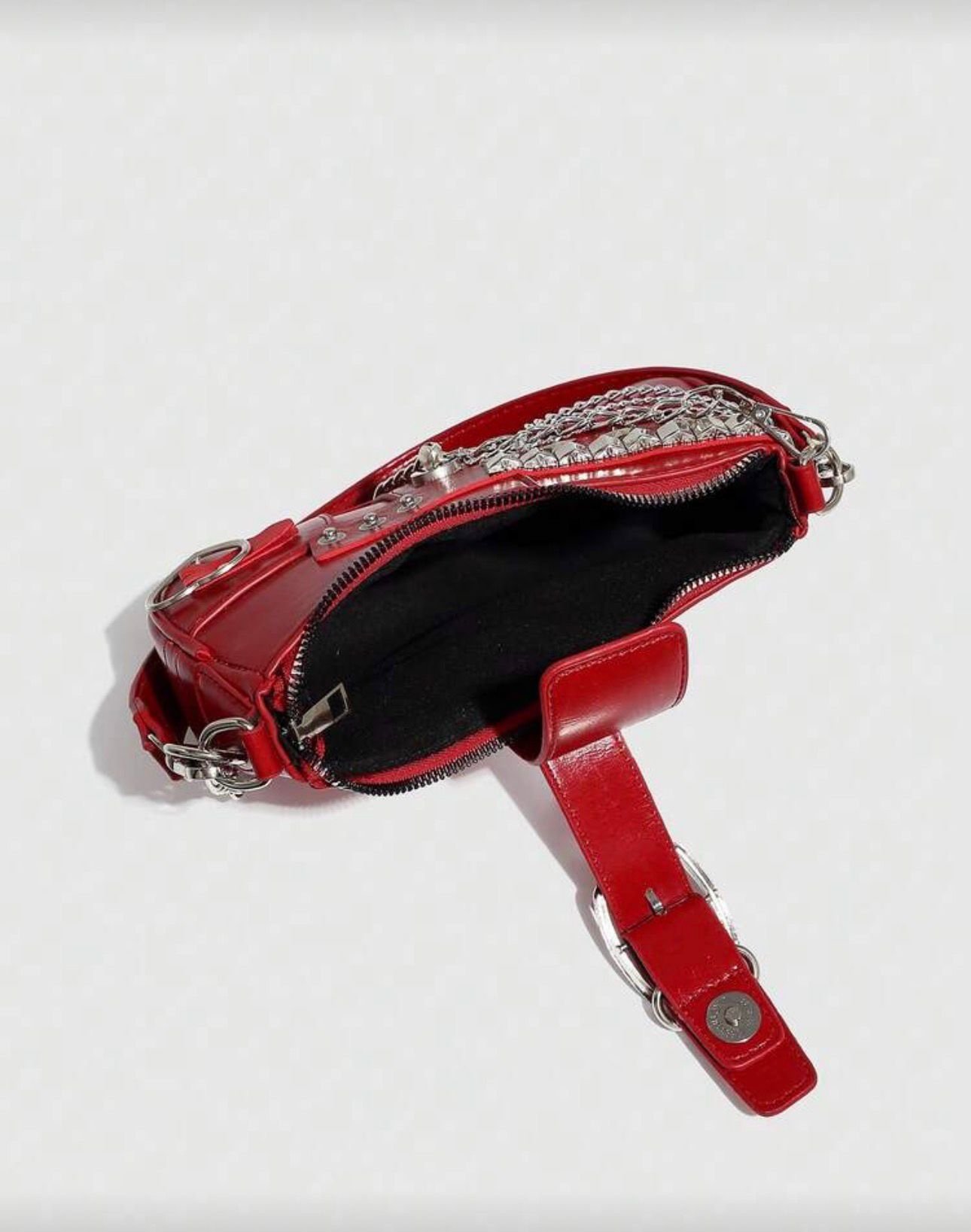 Diese auffällige Schultertasche in glänzendem Rot ist ein echtes Statement-Piece und bringt sofort Farbe in jedes Outfit. Das Design kombiniert edgy Elemente wie silberfarbene Ketten, Nieten und Stern-Details mit einer markanten Frontschnalle für einen modernen Y2K-Look.