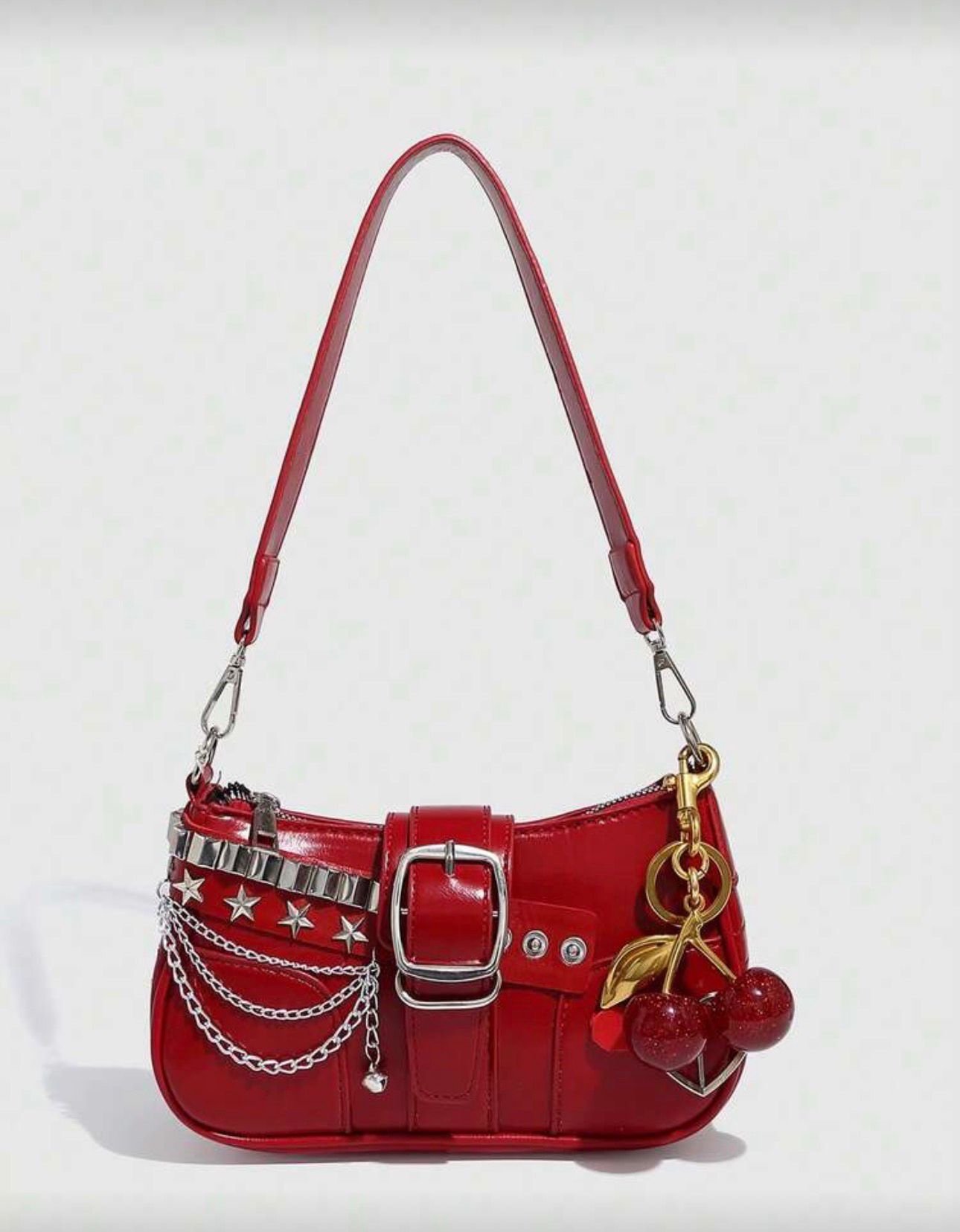 HomeShopTaschenRote Schultertasche mit Schnalle, Ketten & Cherry-Anhänger